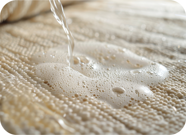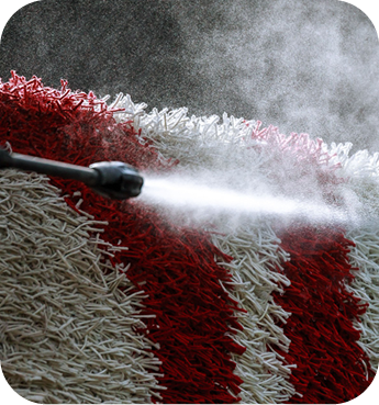 係用地毯清洗機配合防霉高泡地毯清潔劑,針對地毯深層之毛屑、泥沙、污垢進行清洗。地毯於清洗前,會先以 3M 去漬劑及酵素,對地毯上沾污的咖啡、茶等污漬進行局部處理與噴灑,讓其分解後再全面清洗。依據地毯的髒污程度,必要時會反覆清洗,最後以強力吸水機將污水徹底吸除。
